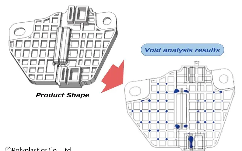 A tecnologia de predição de vazios desenvolvida pela Polyplastics considera variáveis críticas do processo, como temperatura e pressão, durante a solidificação da resina. Este software é capaz de analisar a forma da peça, as condições de moldagem e os efeitos das alterações na posição do portão, garantindo que as previsões de localização e tamanho dos vazios sejam precisas.