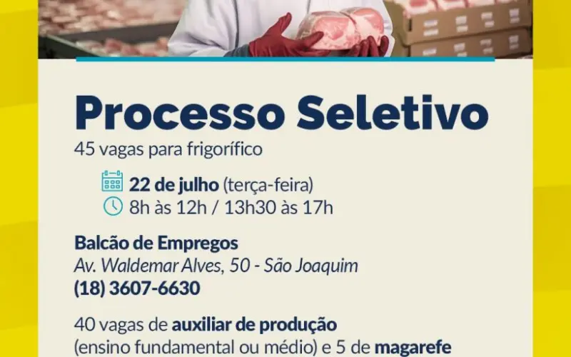 A seleção será feita das 8h às 12h e das 13h30 às 17h, na Avenida Waldemar Alves, 50, no Bairro São Joaquim. As oportunidades são exclusivas para moradores do município e contam com benefícios como transporte, refeição na empresa e vale-alimentação, tornando as vagas ainda mais atrativas para a população local.