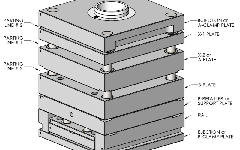 O tipo de base de molde especificamente projetado para moldes de três placas chama-se base T-Series. Esta base se assemelha a uma base A-Series, mas inclui uma placa adicional entre a Placa de Aperto de Injeção e a Placa A. A esta placa extra, comumente chamada de Placa Stripper ou Placa do Runner, confere-se um papel crucial na funcionalidade do molde. Um molde de três placas possui no mínimo três linhas de separação, sem um número máximo definido.